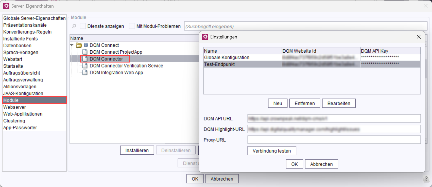 Das DQM Connect-Modul muss für jedes Projekt einzeln aktiviert und ein Endpunkt ausgewählt werden.