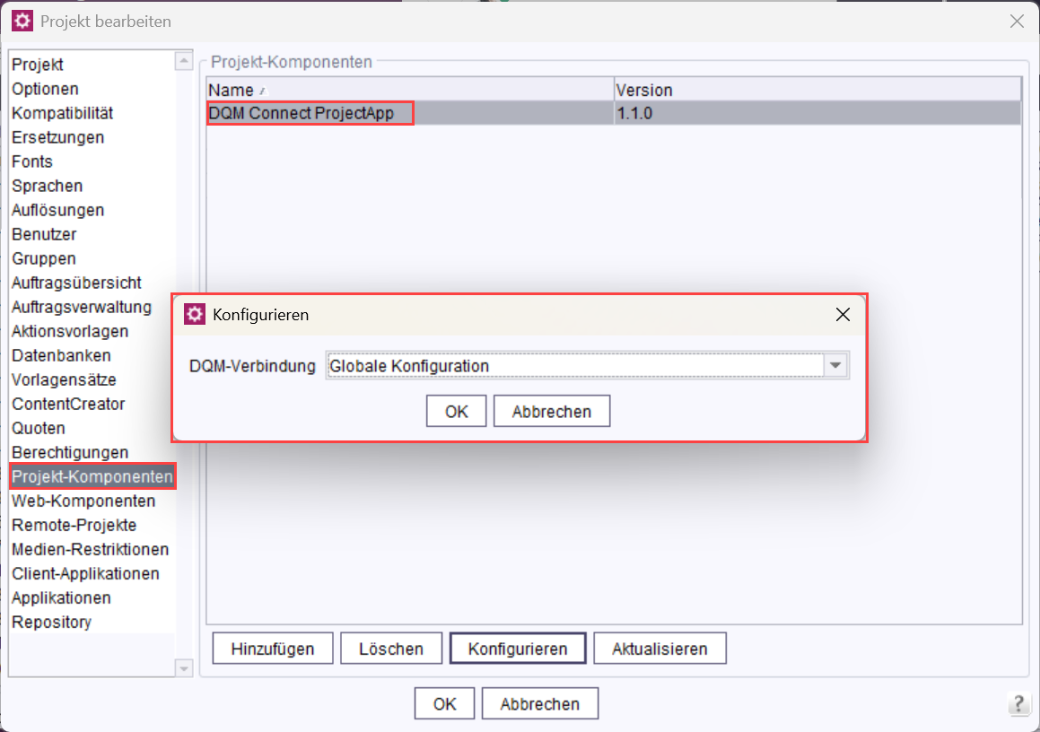 - Navigieren Sie zu ServerManager > Projektauswahl > Projektkomponenten > DQM Connect ProjectApp.