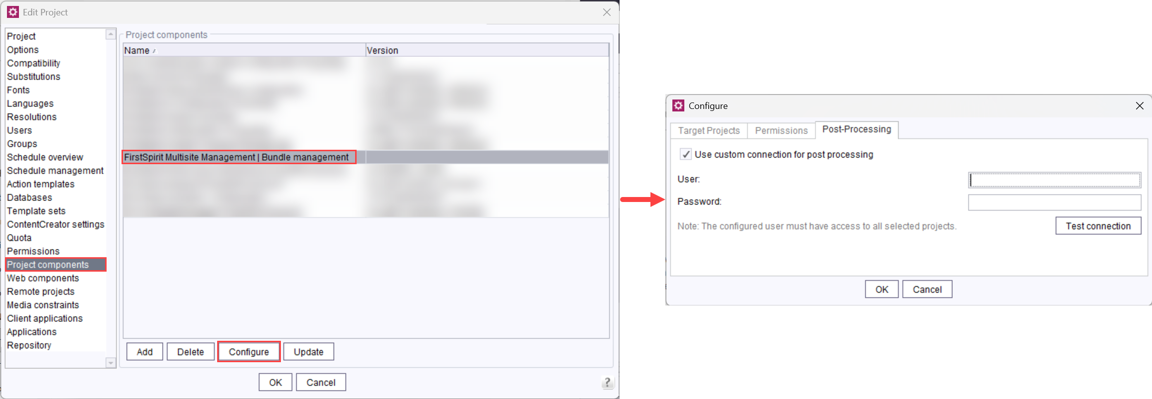 In the Post-Processing tab, enter the User and the associated Password. To verify the configuration and ensure that the specified user has access to all target projects, click on Test connection.